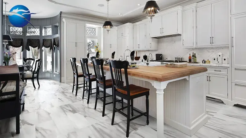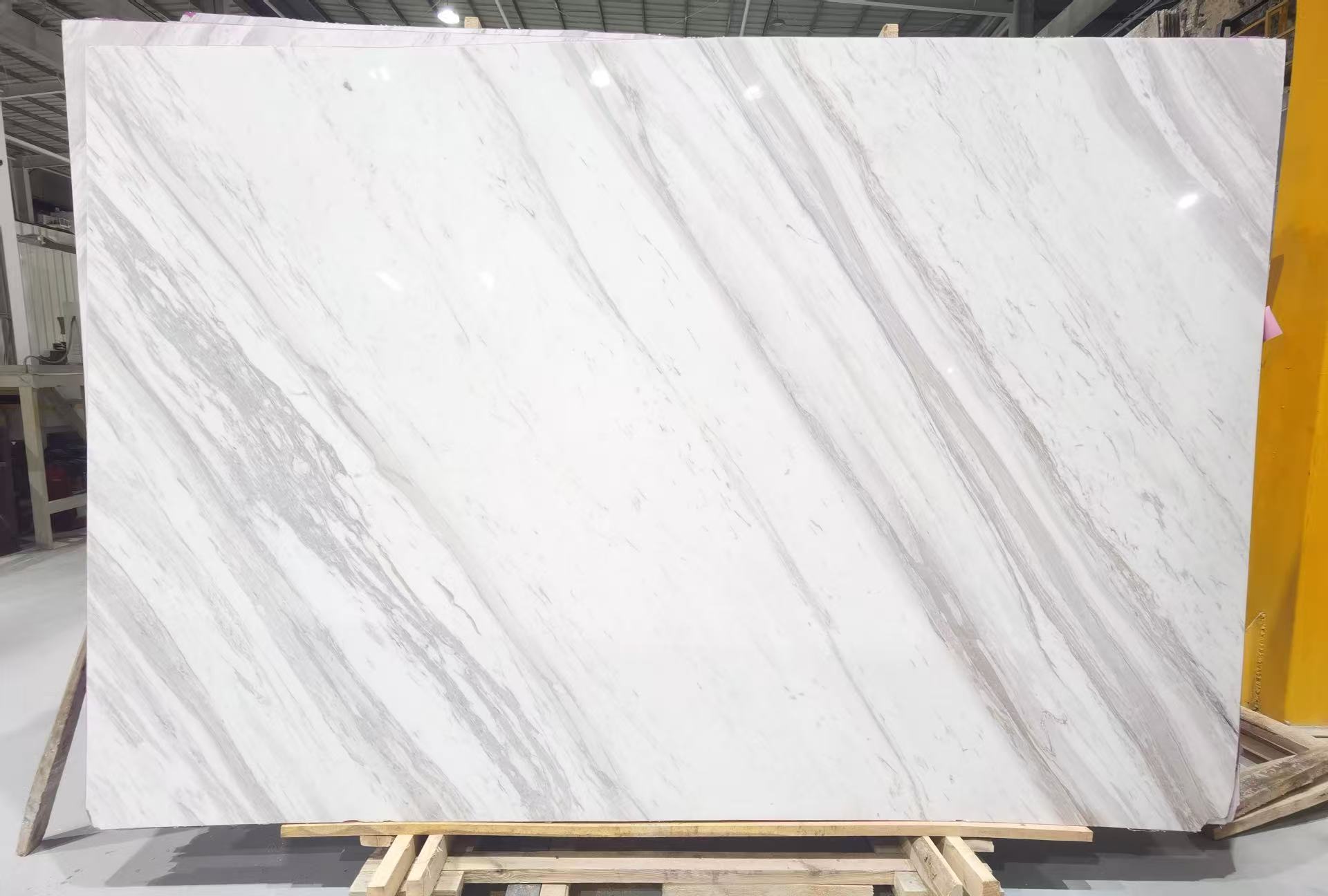 Volakas-natural marble, showcases a striking pattern, with sweeping grey veins that weave across its white base in bold, organic lines. These veins vary in intensity, creating depth and contrast, while hints of earthy brown add warmth and complexity to the design. The intricate, layered patterns give each slab a unique, flowing character that draws the eye and brings a sense of movement to any setting.
